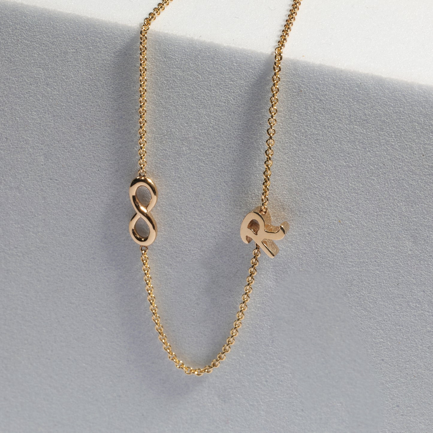 crafted in 18ct australian solid gold, the flowing infinity sits in quiet balance with your letter detail, creating a piece that feels intimate, refined, and unmistakably yours.